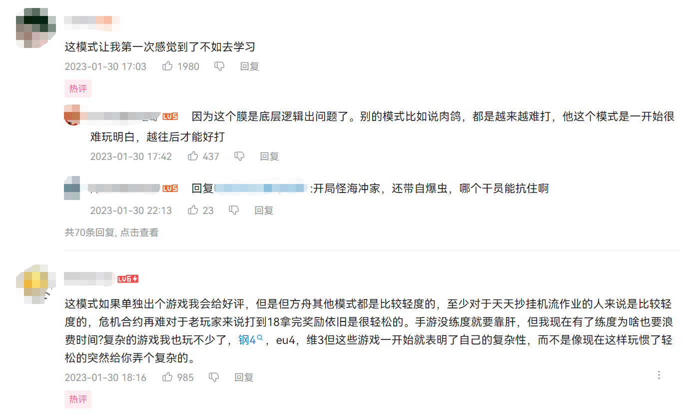 这次活动同样不需要消耗游戏体力,同时作为一个游戏里的活动玩法,其可玩度和完成度都相当高,但与当初“危机合约”和“集成战略”的好评如潮相比,“生息演算”的玩家反馈却不甚乐观。