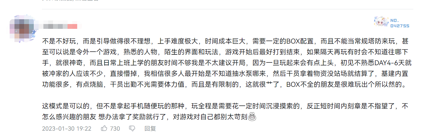 而这些评价出现的表面原因,一部分在于“生息演算”本身的生存基建玩法设计脱离《明日方舟》的塔防设计太多,让玩家在上手上不如以前的副玩法容易。更多的声音却还是集中在“时间”这一点上。