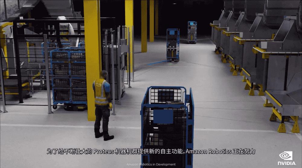 老黄在演讲期间分享了一个视频,展示亚马逊如何用英伟达Omniverse平台构建完全逼真的数字孪生机器人仓库,以节省时间和金钱。