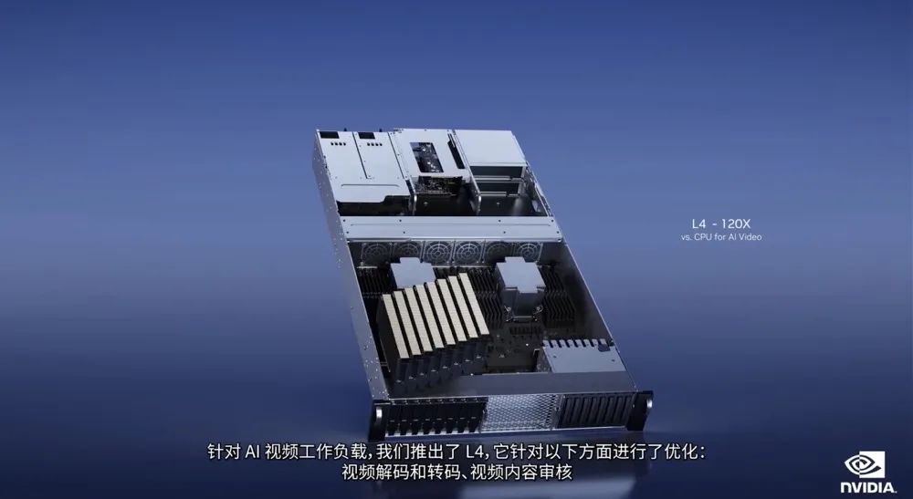 (1)L4:针对AI视频设计的通用GPU,可提供比CPU高120倍的AI视频性能,能效提高99%;优化了视频解码与转码、视频内容审核、视频通话等功能,如背景替换、重新打光、眼神交流、转录和实时翻译等。一台8-GPU L4服务器将取代100多台用于处理AI视频的双插槽CPU服务器。