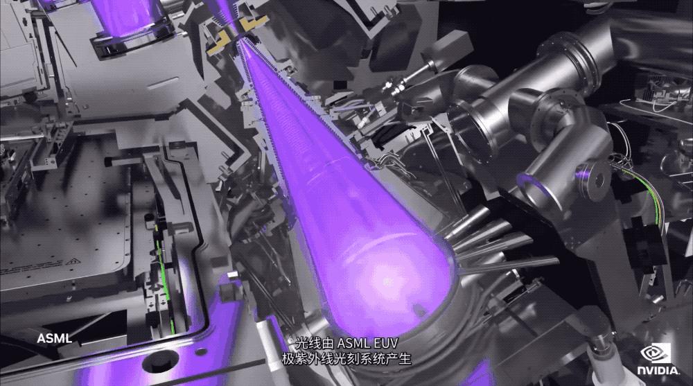老黄还直接上了一堂光刻机小课堂,配合动画讲解芯片制造的最关键设备光刻机是如何运作的。