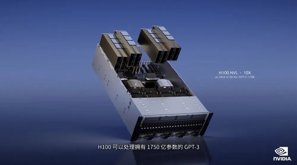 老黄说,目前在云上唯一可以实际处理ChatGPT的GPU是HGX A100。与适用于GPT-3处理的HGX A100相比,一台搭载4对H100及双GPU NVLink的标准服务器的速度要快10倍,H100可将大型语言模型的处理成本降低一个数量级。