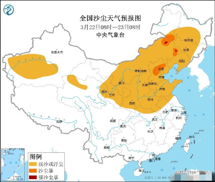 中央气象台2023年3月22日6时继续发布沙尘暴黄色预警称,受冷空气大风影响,预计3月22日8时至23日8时,新疆南部、青海北部、甘肃中南部、宁夏、内蒙古大部、陕西大部、山西、河北、北京、天津、黑龙江中西部、吉林中西部、辽宁、山东、河南、江苏北部、安徽北部、湖北北部等地的部分地区有扬沙或浮尘天气,其中,内蒙古东南部、北京、天津北部、河北中北部等地的部分地区有沙尘暴,局地有强沙尘暴。