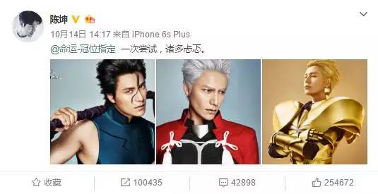 前几天,陈坤在微博上发出三张手游《Fate/Grand Order》角色扮相的照片,截止到撰稿时微博已经有超过10万转发和25万点赞,更神奇的是这三张照片还在日本Twitter上疯狂扩散成为了当日最热推文。这三张风靡中日的照片可谓是二次元的一次空前狂欢。为什么极度苛刻的二次元用户会这么认可陈坤?在手游代言人系列,陈坤并不算是最火的明星,但根据市场的反应来看,陈坤这次的代言却取得了巨大的反响,为此我们不禁要思考一个问题,手游应该如何选择最合适的代言人?