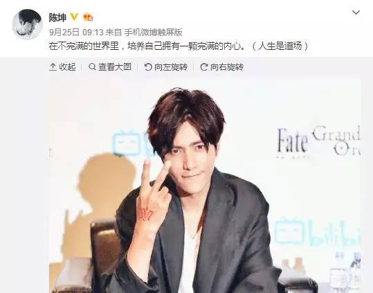 陈坤可以说是目前配合度最高的手游代言人。一般的采访中也经常会谈起对二次元的看法,思考二次元虚拟世界与三次元现实世界的区别。即使是发布会、微博这些必选项也做得比一般代言人要足很多,发布会上表示会用代言费为游戏氪金。并一个月不到的时间里,在微博上四谈《FGO》相关内容。