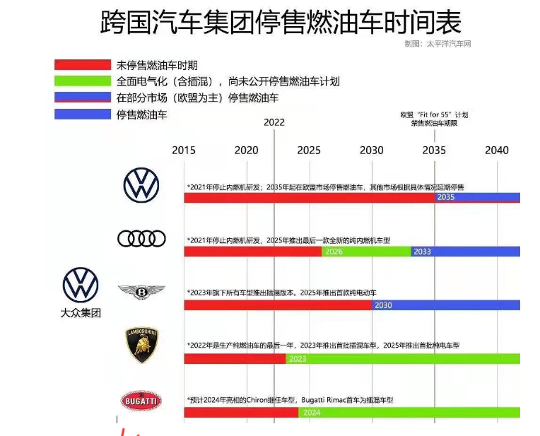 丰田也表示计划2030年率先于中国、欧洲、北美地区停售燃油车。日产也计划将在2025年全面停售燃油车,同时通用和福特也已经明确未来将停售传统燃油车。