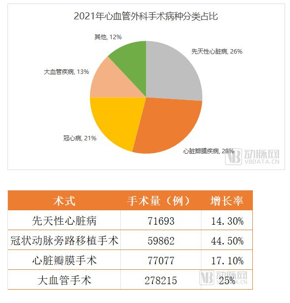 心外科增速较快的手术还包括大血管疾病手术。大血管疾病主要是指主动脉疾病,分为狭窄型和扩张型两种,大血管疾病手术量增速突出,2021年手术量增速达到25%。