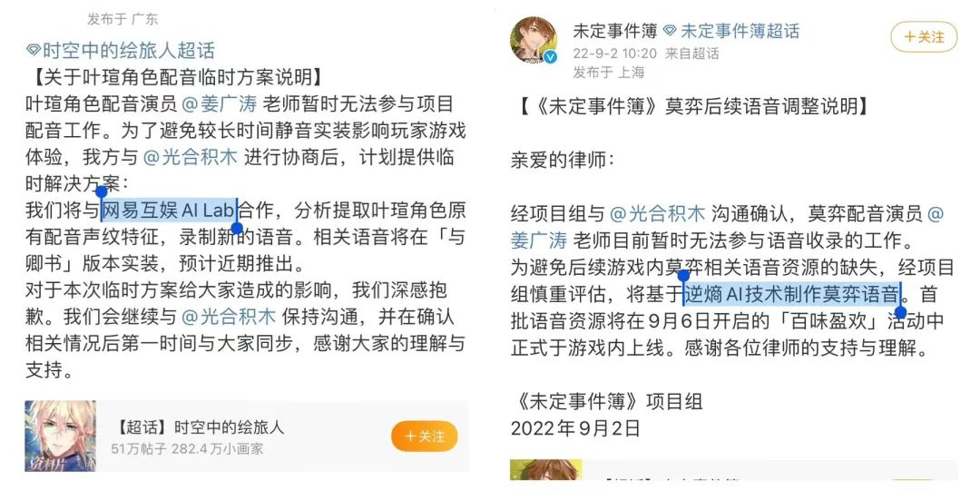 今年8月,圈内“元老”之一的姜广涛因商业经济纠纷、被带走配合调查,姜广涛的粉丝等了近三个月,还没等来偶像的最新消息,而《未定事件簿》《时空中的绘旅人》两部采用他配音的乙女游戏,全部宣布用AI声音采样替代姜广涛本人。