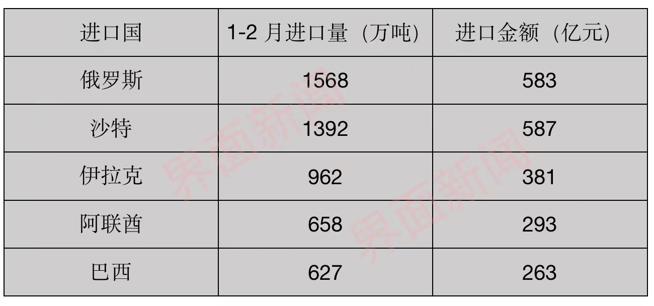 海关总署数据显示,今年1-2月,中国从俄罗斯进口的原油总量为1568万吨,同比增长23.8%,占中国原油总进口量的19%,在30个进口来源国中位居第一;进口金额为583亿元,同比增加18%,吨油进口金额同比下降约4%。