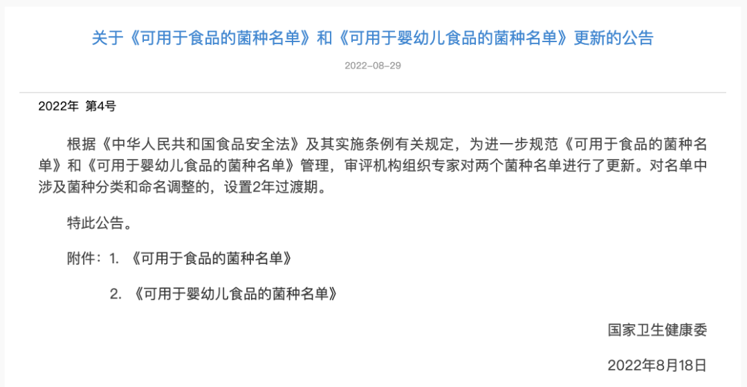一个佐证是,去年8月,国家卫健委更新了《可用于婴幼儿食品的菌种名单》。