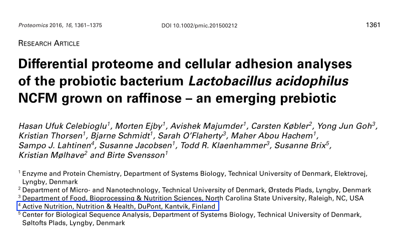 2016年,杜邦公司参与的有关嗜酸乳杆菌NCFM的一个突破性合作研究项目还登上《蛋白质组学(Proteomics)》的封面。