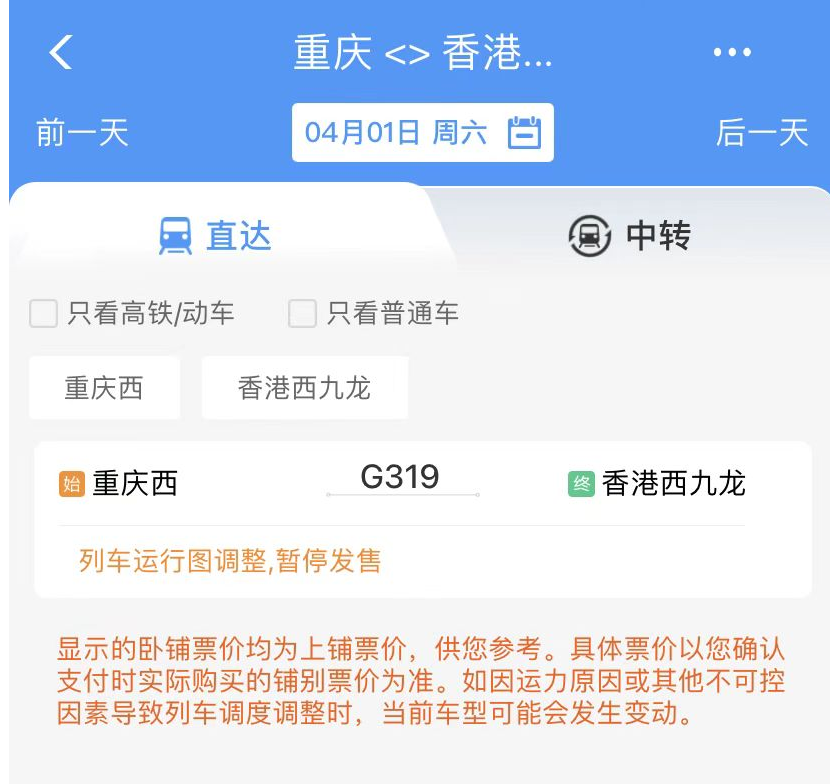 重庆直达香港高铁现于2023年4月1日重庆直达香港高铁又一次正式恢复通行,并于3月23日6时起正式售票。