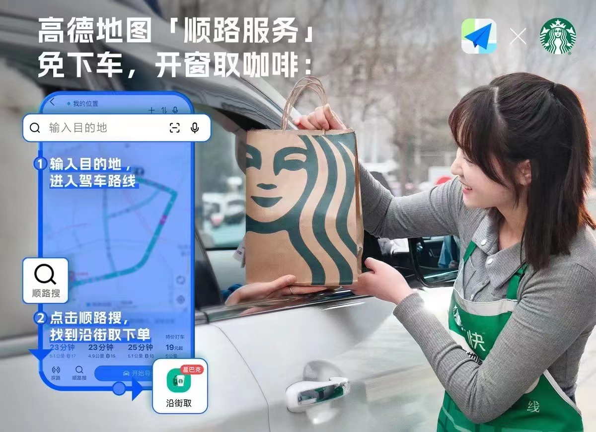 3月21日,星巴克中国与高德宣布推出“啡快·沿街取”服务。用户在驾车出发前,使用高德地图导航,即可在“顺路搜”中选择“沿街取”服务,向系统推荐的沿途星巴克门店点单;在用户到达门店附近的临时停车点时,只需打开车窗就可从星巴克咖啡师手中接过咖啡。
