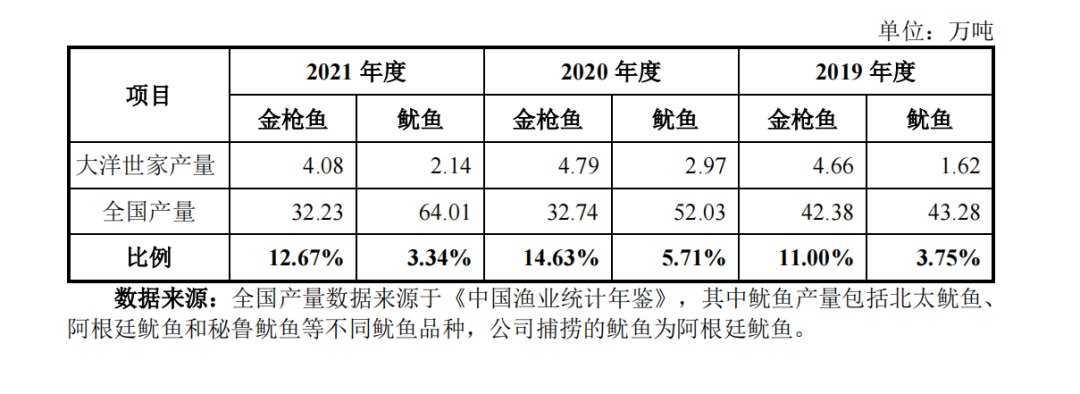 数据显示,2019年至2021年,大洋世家金枪鱼的产量分别是4.66万吨、4.79万吨以及4.08万吨,占全国产量的11%、14.63%以及12.67%。其中加工品冻煮金枪鱼肉的销量分别约为2.33万吨、2.36万吨、2.53万吨,产销率在报告期内达到了89.44%、103.47、101.40%。