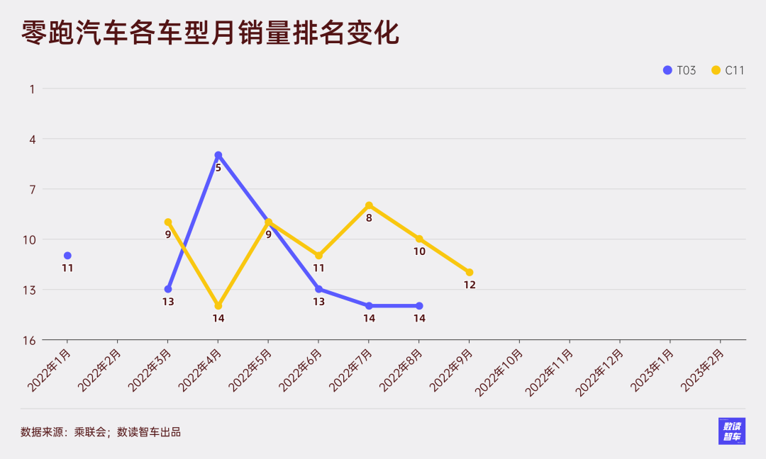 在乘联会的月度排名中,前九个月,主力车型T03和C11是常客,可10月开始,零跑再也没有哪怕一款车型上过榜。