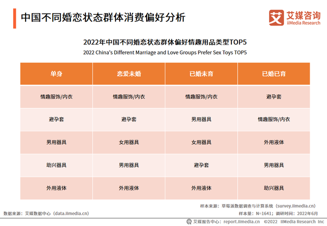 艾媒咨询发布的《2022-2023年中国情趣用品行业及消费行为调查分析报告》显示,中国消费者最为偏好的情趣用品类型包括避孕套、情趣内衣,占比分别为55.9%和53.8%。报告还显示,单身、恋爱未婚、已婚已育群体都比较偏向于使用避孕套,涉及人群广泛。