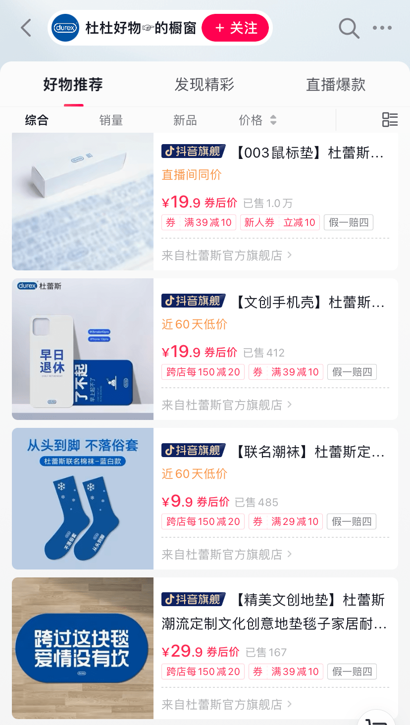 在这场小型流量狂欢中,“主角”是杜蕾斯最近开启直播带货的抖音账号“杜杜好物”。