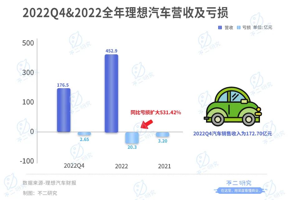 「不二研究」据理想汽车最新财报发现:2022年理想汽车营收452.9亿元,同比增加67.7%;同期,其净亏损为20.3亿元,同比扩大531.42%。