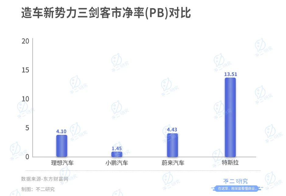 「不二研究」对比造车新势力三剑客的PE值(市盈率)、PB值(市净率)发现,截止美东时间3月2日美股收盘,造车新势力的PE值均为负数,PB值依次为:理想4.10、小鹏1.45、蔚来4.43,而另外的特斯拉的PB值为13.51。