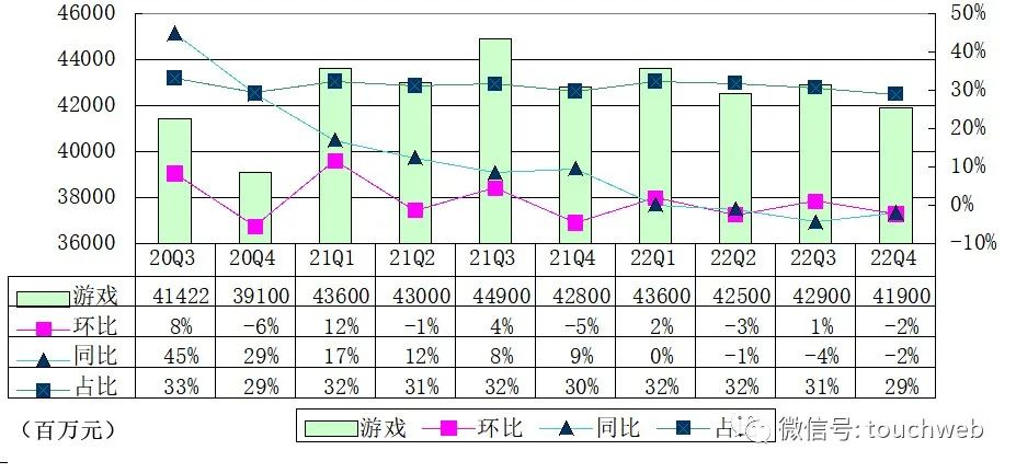 腾讯2022年第四季度增值服务业务营收为704亿元,同比下降2%,其中,腾讯游戏收入为419亿元,同比下降2%,游戏收入占总收入比例为29%。