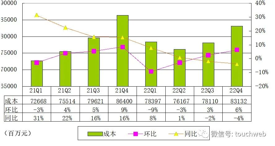 腾讯2022年第四季度成本为831亿元,较上年同期下降4%,反映了渠道及分销成本以及云项目部署成本收紧。以收入百分比计,收入成本由2021年第四季的60%下降至2022年第四季的57%,反映了降本增效措施带来的效益。