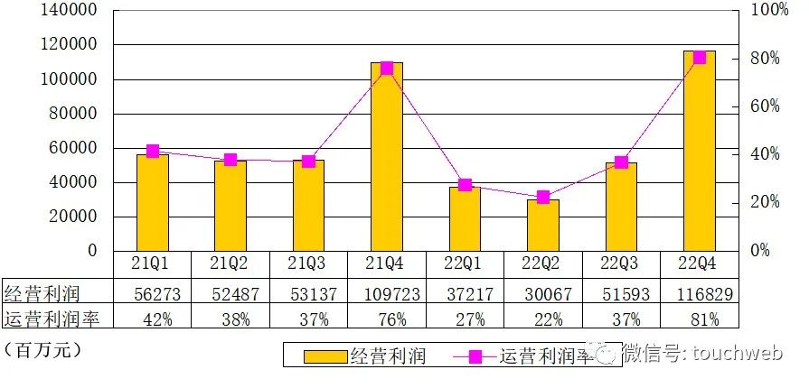 按非国际财务报告准则,腾讯2022年第四季度经营盈利为394亿元(57亿美元),同比增长19%;经营利润率由上年同期的23%上升至27%。