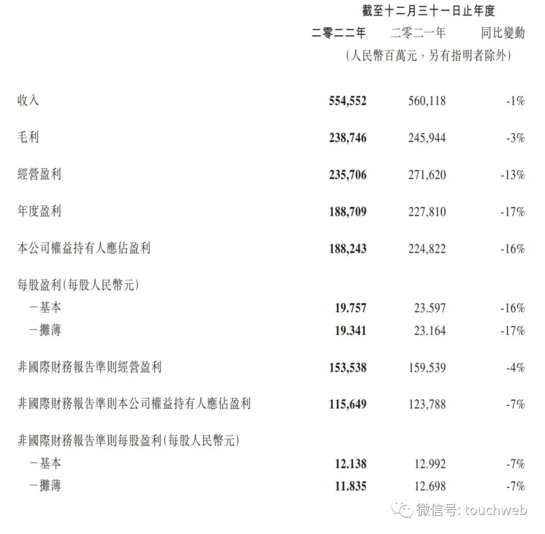 腾讯2022年按国际财务报告准则经营盈利为2357亿元(338亿美元),同比下降13%;经营利润率由上年的48%下降至43%;年度盈利为1887亿元(271亿美元),同比降17%;净利润率由上年的41%降至34%。