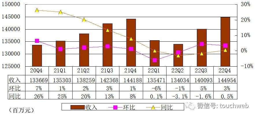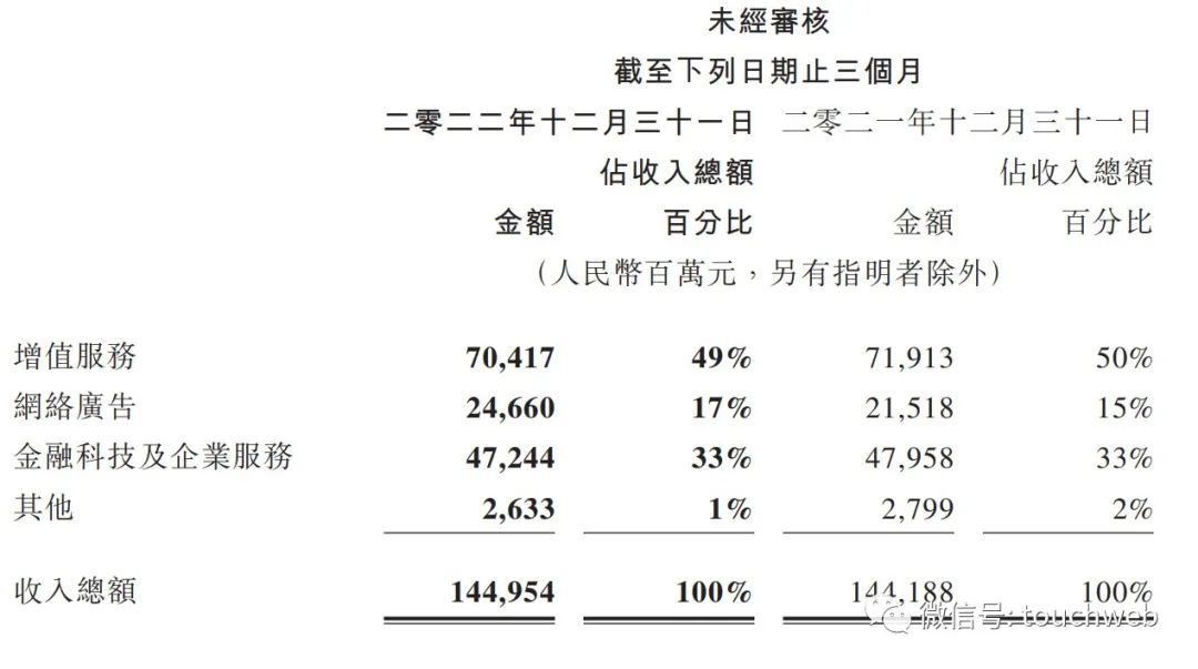 腾讯2022年第四季度营收为1450亿元(208亿美元),较2021年第四季增长0.5%,较上一季度增长了3%。