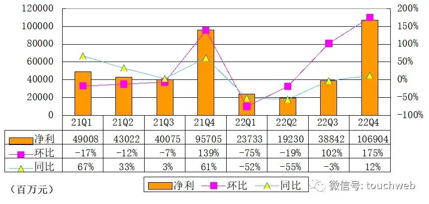 腾讯2022年第四季度期内盈利为1,069亿元(153亿美元),同比增长12%;净利润率由上年同期的66%上升至74%。