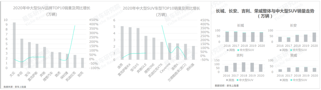 可以看到,2020年,高端合资品牌占据该细分市场TOP10品牌及车型中的7席,主流自主车企只有长城哈弗H9、长安CS95涉足,但销量占比极低。