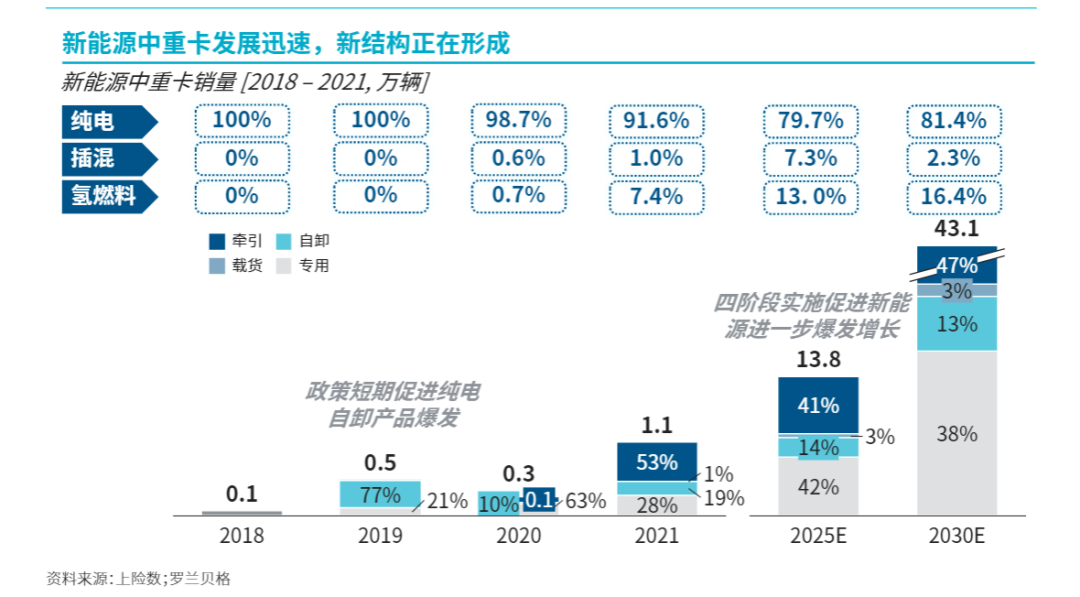 罗兰贝格《新能源商用车白皮书》显示,2025年新能源重卡销量将达到13.8万辆,其中79.7%为纯电车型;预计2030年将突破43万辆,纯电占比为81.4%。重卡电动化方向将从最初的自卸车转向物流运输领域的牵引车突破。