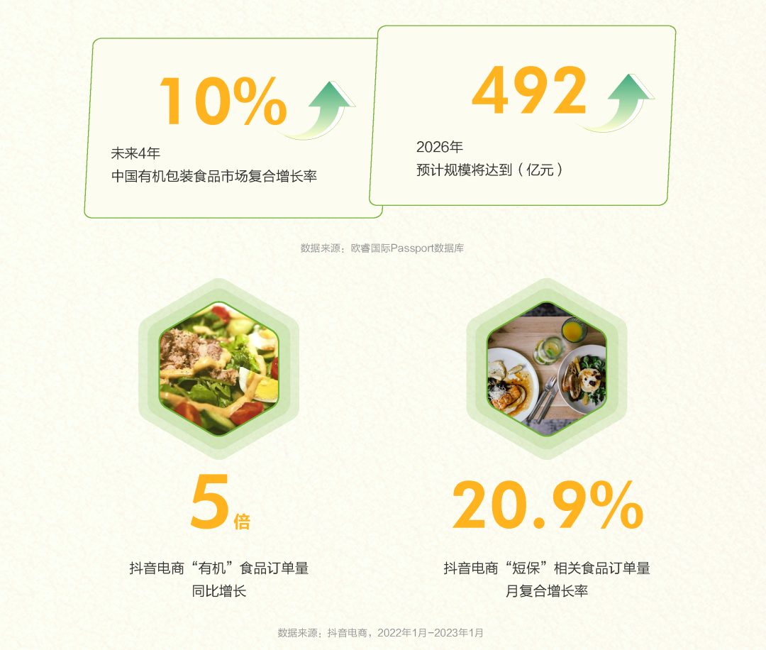 在此趋势下,有机食品、短保质期产品以及生鲜食品获得了更多消费者的青睐,具有有机、零添加、短保特性的产品市场规模快速增长。抖音电商平台数据显示,2022年1月至2023年1月“有机”食品订单量同比增长了5倍,“短保”相关食品订单月复合增量率高达20.9%。