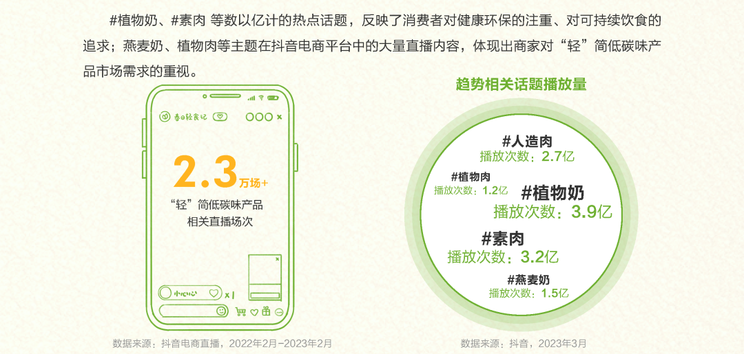 《报告》指出,植物基乳饮、植物基“肉食”等“轻”简低碳味产品的相关直播在抖音电商平台大量涌现,2022年2月至2023年3月期间累积超过了2.3万场,相关产品销售表现亮眼,素食的饮食方式逐渐成为更多消费者的选择。