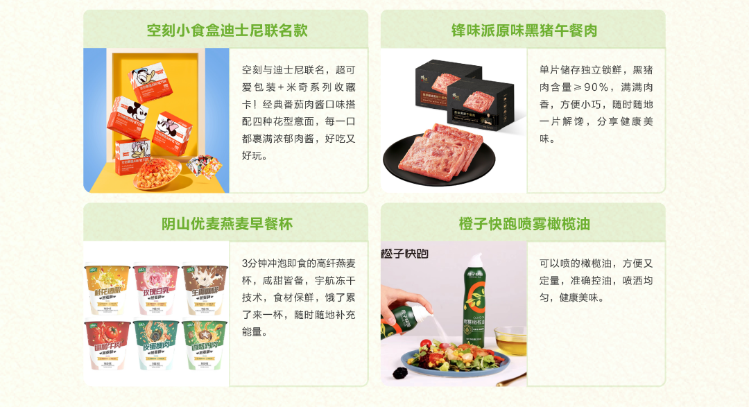 在“轻”颜迷你味的新轻食趋势下,空刻联名迪士尼推出小食盒,经典番茄肉酱口味搭配四种花型意面,好看好玩又好吃。锋味派的原味黑猪肉午餐肉单片包装,独立锁鲜,随时随地一片解馋,便捷易分享。