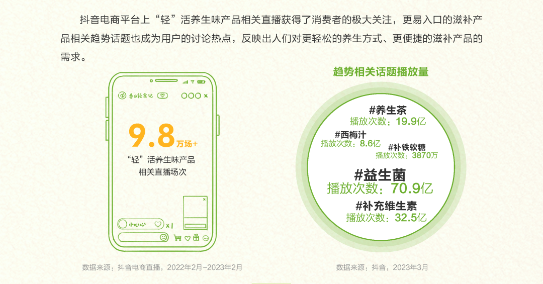 抖音电商数据显示,2022年2月至2023年2月,“轻”活养生味产品相关直播超过了9.8万场。其中,2022年6月至2023年2月,“滋补+软糖”的相关食品订单量月复合增长率高达106.5%,更轻松的养生方式、更便捷的滋补产品在消费人群中具有巨大的市场潜力。