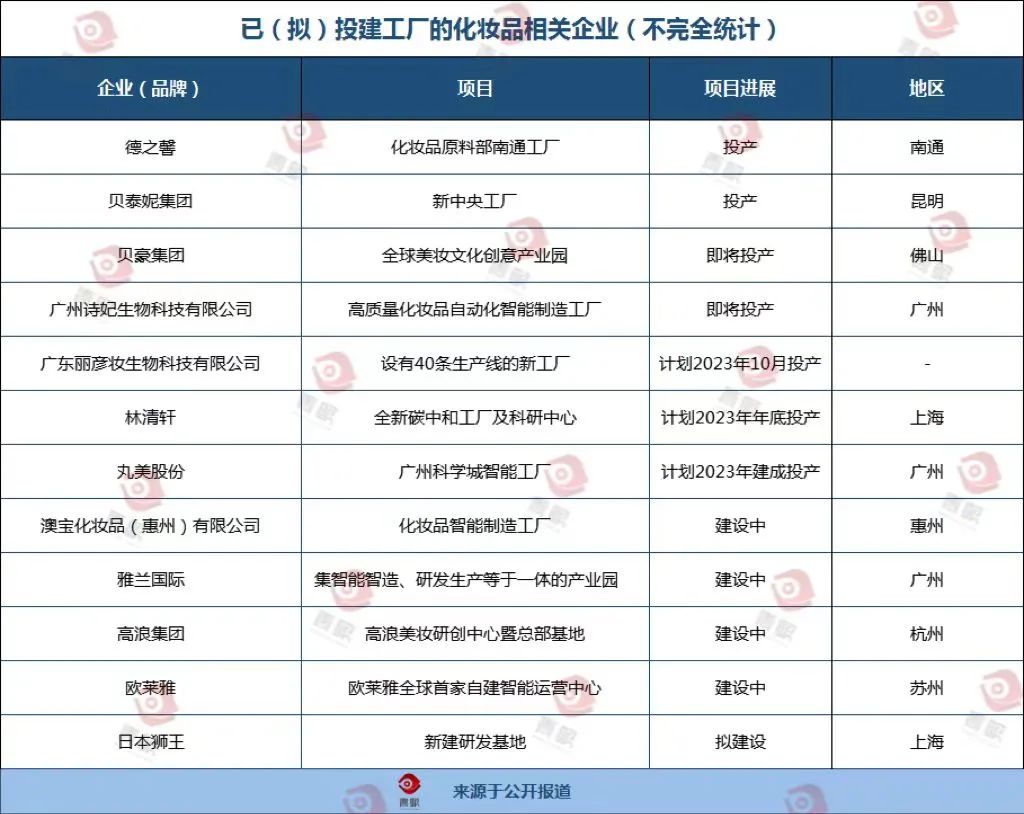 青眼随之统计发现,在近一年时间里,已有至少12家化妆品相关企业宣布已(拟)投建工厂、研发基地。