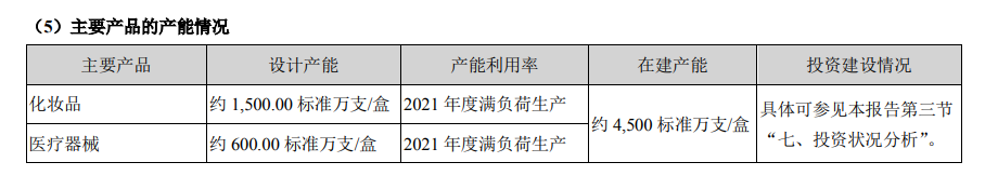 以贝泰妮集团为例,2021年贝泰妮集团实现营业收入40.22亿元,同比增长52.57%。随着业务的不断拓展,产能储备自然是公司不可忽视的关键。但据其年报数据显示,2021年贝泰妮集团化妆品实际产能约1500标准万支/盒,医疗器械约600标准万支/盒,均已出现满负荷生产。