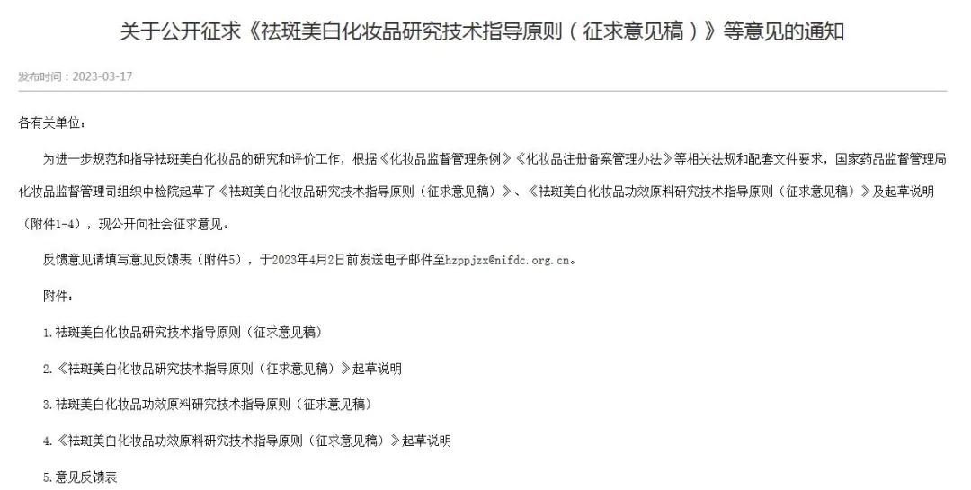 由于,祛斑美白类化妆品主要通过配方中的祛斑美白功效原料发挥作用,功效原料使用的科学合理性对于产品的质量安全至关重要。因此,国家药监局还认为,有必要对祛斑美白功效原料的相关技术问题开展系统性研究、讨论。由此也发布了《祛斑美白化妆品功效原料研究技术指导原则(征求意见稿)》(下称《美白原料指导原则》),用以对祛斑美白功效原料的研究和评价予以规范和指导。