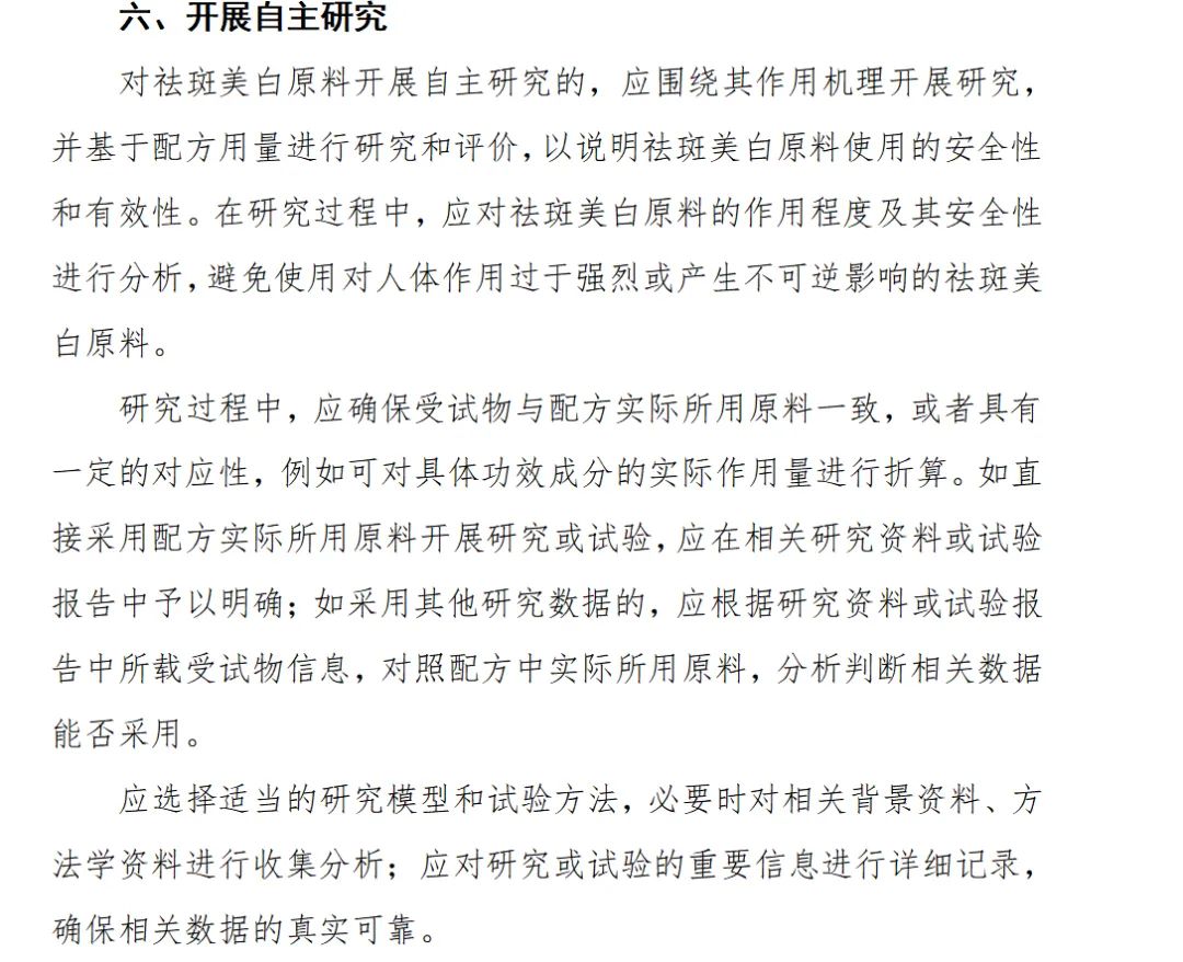 这当中,该原则对所使用的祛斑美白原料开展自主研究的情形进行了详细阐述。譬如,《美白原料指导原则》中即提出,“在研究过程中,应对祛斑美白原料的作用程度及其安全性进行分析,避免使用对人体作用过于强烈或产生不可逆影响的祛斑美白原料。并应确保受试物与配方实际所用原料一致,或者具有一定的对应性,例如可对具体功效成分的实际作用量进行折算等”。
