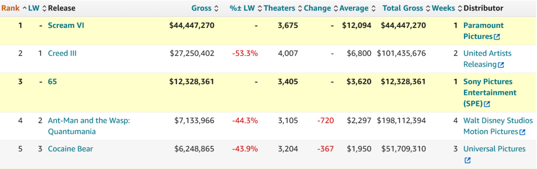 据The-Numbers统计,《惊声尖叫6》在提前场便进账570万美元,在近两年的恐怖片中仅次于《不》(640万美元)。随后《惊声尖叫6》铺开至北美3675家影院,周五含零点共拿下1929万美元,击败《奎迪3》夺得单日冠军;接下来两天《惊声尖叫6》环比下滑20和37%,周末票房最终报收于4445万美元,单馆收益达到1.2万美元。