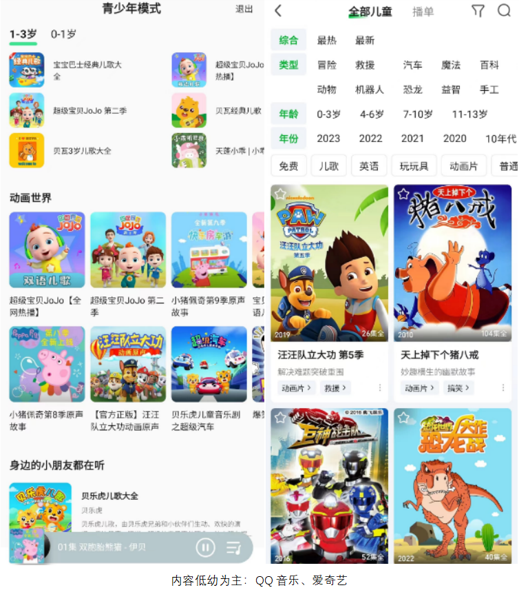 内容分级不到位的APP则可以视作反面教材。QQ音乐,打开青少年模式之后可选的年龄只有0-1岁,1-3岁。同样主打低幼风的爱奇艺,虽然年龄有0-13岁可选,但内容整体以动画为主。