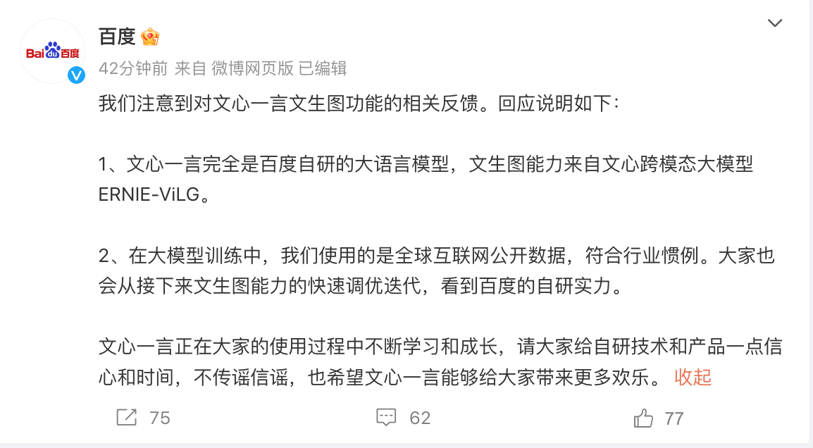 百度表示,在大模型训练中,其使用的是互联网公开数据,符合行业惯例,“大家也会从接下来文生图能力的快速调优迭代,看到百度的自研实力。”