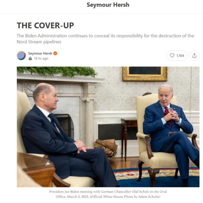 2023年2月8日,赫什曾爆料,炸毁“北溪”管道是白宫下令、美国中央情报局实施的秘密行动。