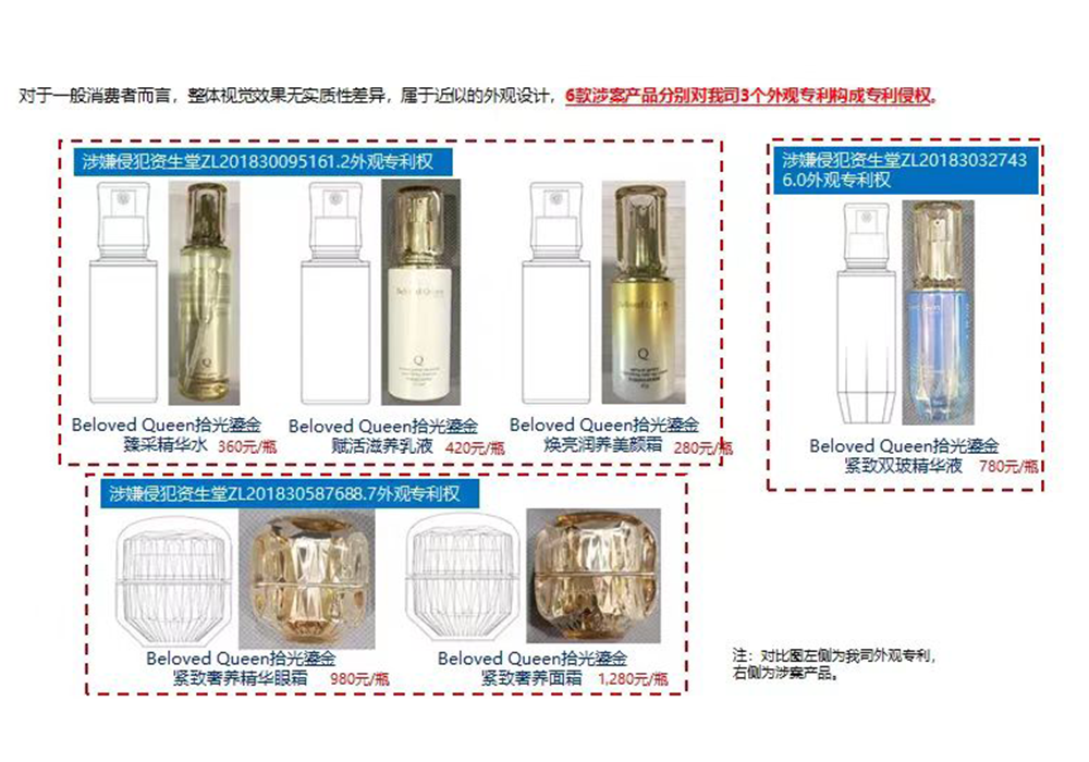 资生堂旗下高端护肤品牌CPB肌肤之钥也未能幸免,资生堂中国经调查发现,浙江美人计健康科技集团有限公司、浙江美美与共化妆品科技有限公司、苏州元美科技有限公司制造、南京美玉文化创意有限公司销售并宣传推广的“Beloved Queen挚爱女王”产品,侵害了资生堂集团旗下高端品牌CPB肌肤之钥的三个外观设计专利权。