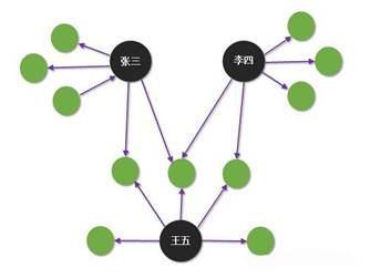 比如,有些组团欺诈的成员会用虚假的身份去申请贷款,但部分信息是共享的。从下图中可以看出张三、李四和王五之间没有直接的关系,但通过关系网络我们很容易看出这三者之间都共享着某一部分信息,这就让我们马上联想到欺诈风险。