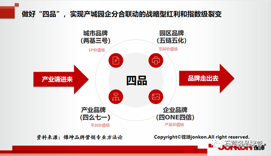 在这种背景下,辅导和服务了东方美谷、上海湾区、北京未来美城、广州白云美湾等多个全国知名产城高地的品牌服务商锦坤创始人、《城市品牌顶层设计》作者石章强提出了产城园企“四品合一”理论,指导城市品牌、产业品牌、园区品牌和企业品牌的分合联动和相融共生。