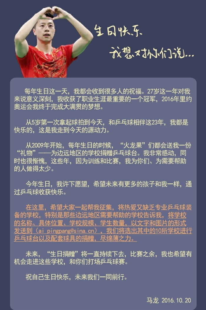 马龙28岁生日发起捐赠——“真正为乒球而生的天才。”