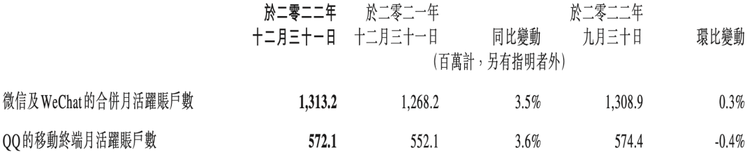 用户规模逐渐见顶的微信,依然保持了同比、环比的小幅增长,截止2022年12月31日,微信和Wechat合并月活用户为13.13亿,同比和环比分别增长3.5%、0.3%。