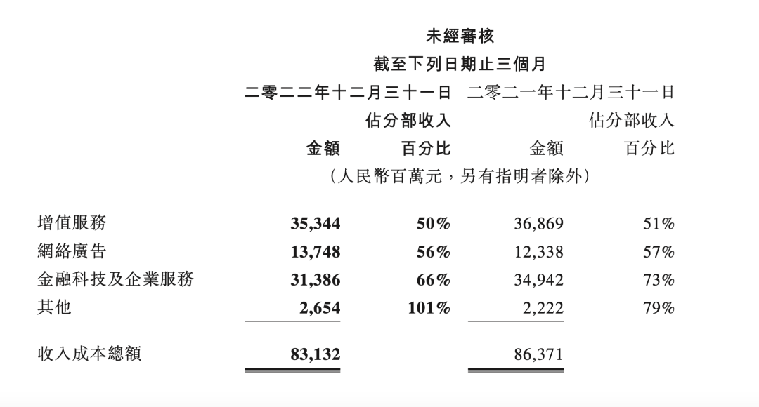 从业务板块来看,在三大收入支柱(增值服务、网络广告,金融科技及企业服务)中,成本收入比全线下降,下降幅度从1%到7%不等。下降幅度最大的是金融科技及企业服务,从2021年Q4的73%下降到66%。