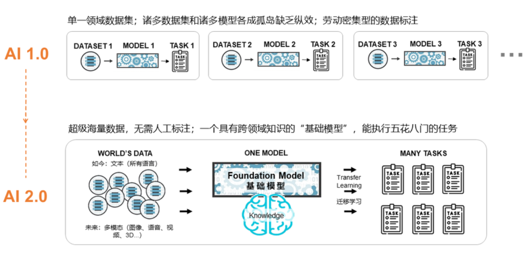 相较于AI 1.0时代,AI 2.0技术能兼容更多的场景和领域,不仅仅只是做一个大模型通用于各行各业,而更多的是在一个垂类场景下,用更低的成本实现更高的通用性和实用性。
